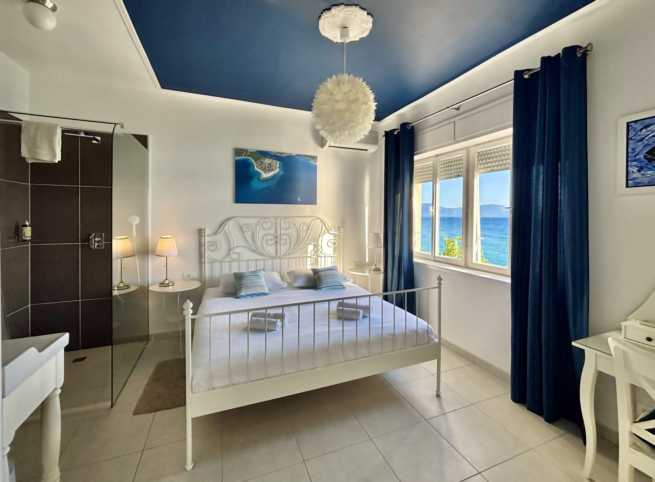 The Mare Room is a bright, white retreat accented with soft blue details and a distinctive blue ceiling, evoking the colours of the open sea and sky. Although the room has no balcony, it offers the closest and most immersive sea view in the house.